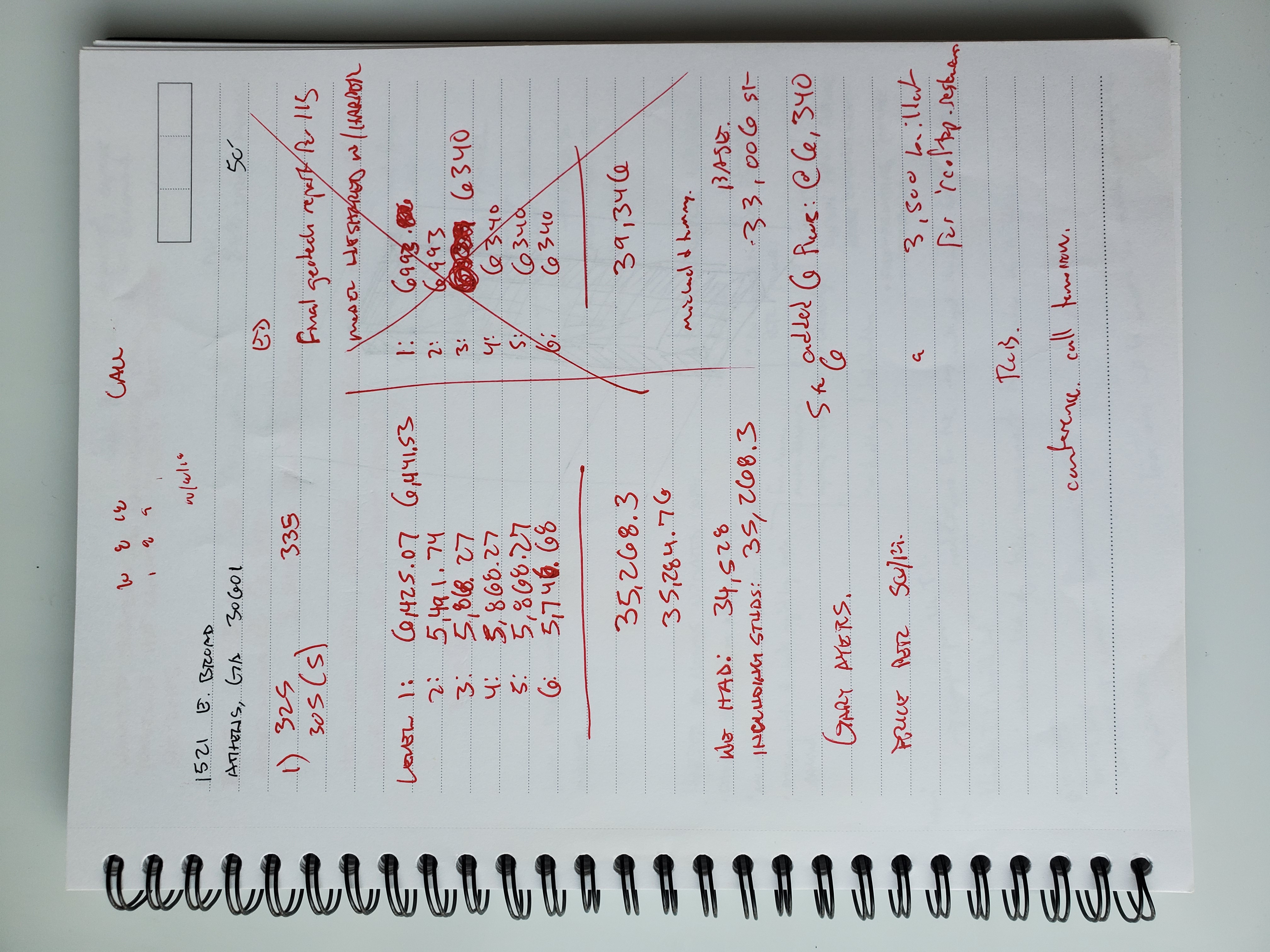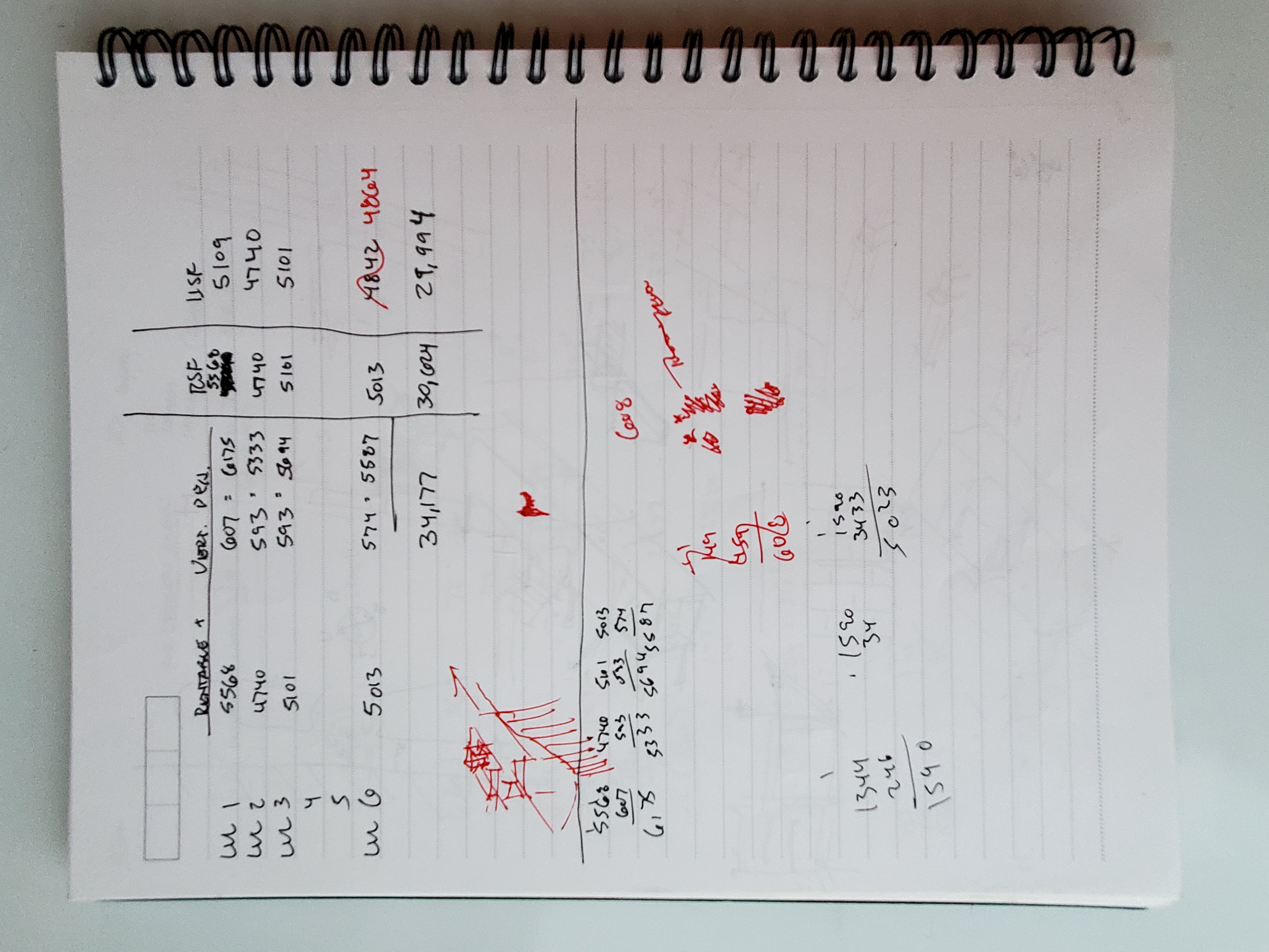 Everywhere I’ve worked, I’ve always kept a notebook at arm’s length throughout the day. Among other things, I use it for quick math tabulations I need to do on the fly. I thumbed through some past notebooks, looking for calculations I’ve actually had to do for my job. They’re comically simple. What I found corroborates everything I’ve said so far, and should quell any math-related fears you might have. Take a look. (And yes, I know my handwriting looks like it was done by a doctor with an amputated thumb. I’m aware).